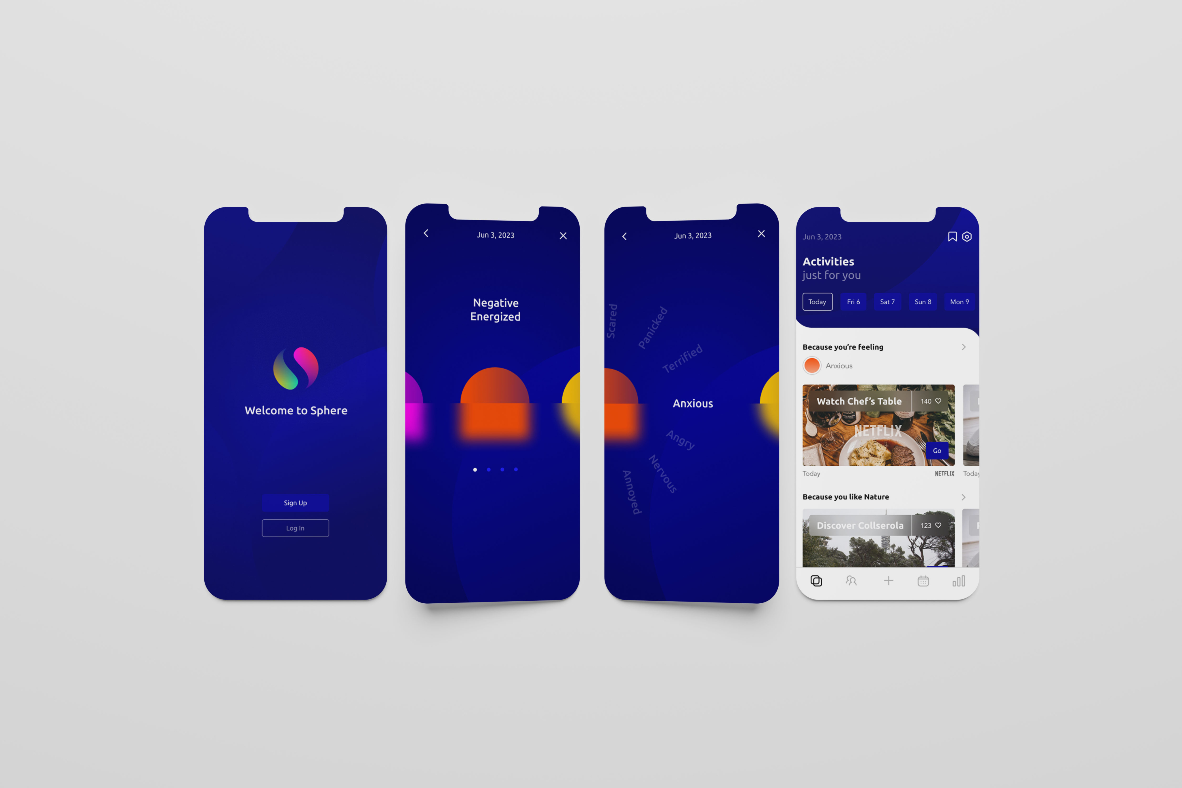 Sphere demonstrates how UX/UI design can play a role in supporting mental wellbeing. By combining daily mood tracking with personalized activity suggestions, the app empowers users to build self-awareness, organize their time, and take proactive steps toward improving their emotional health. Unlike many mood trackers, Sphere focuses not only on logging emotions but also on turning insights into actionable routines.